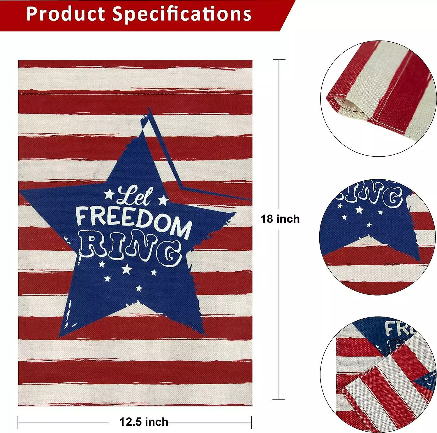 Durable and Higher Quality: The patriotic garden flag made of high quality machine washable spun polyester which is weather resistant as well as UV / fade-resistant, beautiful in design, fine in craftsmanship, and multiple rows of double-stitched panels and high-quality sleeve provide lasting strength to our 4th of july garden flag.Weather Resistant: No matter if the weather is bad, in wind, rain or snow, our 4th of july garden flag can still stay in good condition. This makes our yard flag perfect for long term use in your garden as patriotic decorations.Home Patriotic Decorations: Welcome guests to your home with this unique, patriotic yard flag. Our patriotic flag is perfect for any deck, patio, porch or veranda and make charming decorative statements for any backyard, lawn or garden.