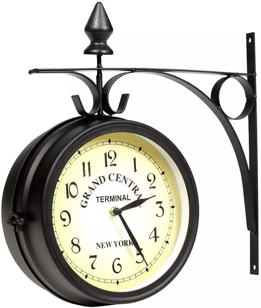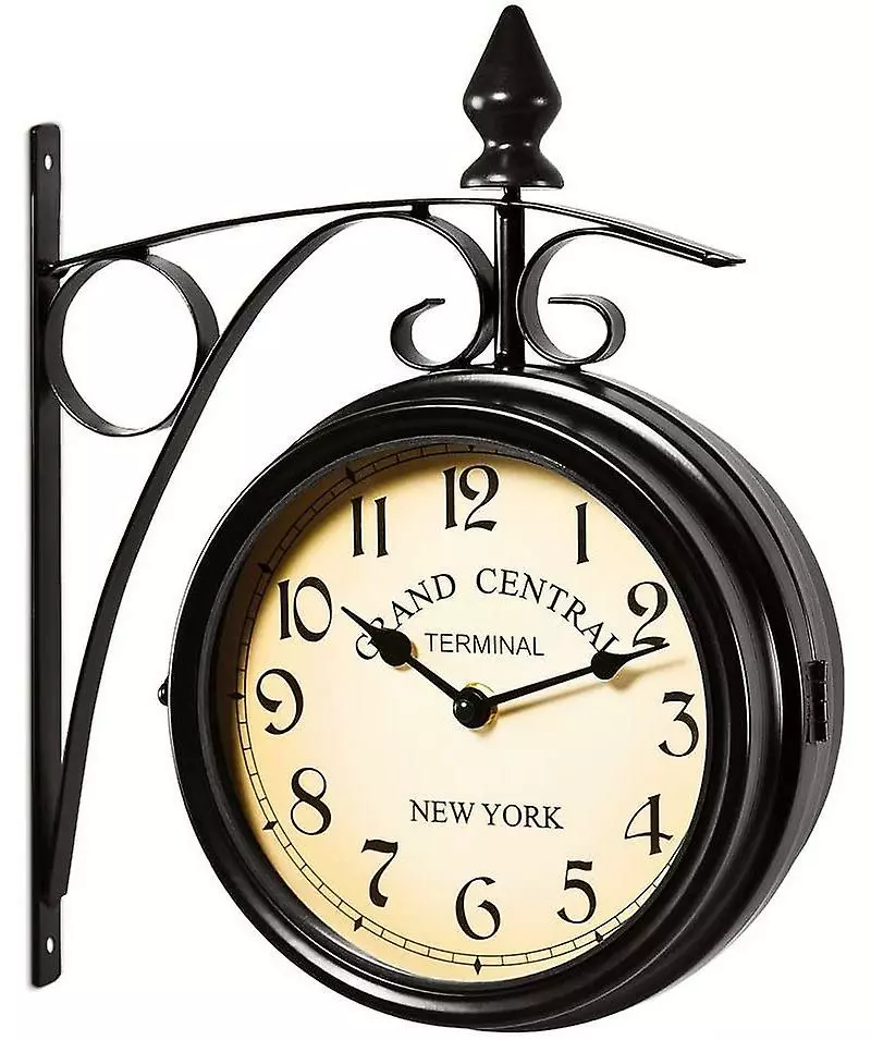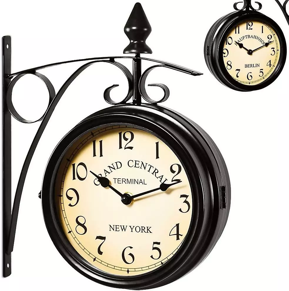 Please note that the wall clock does not have a waterproof system and cannot be installed in an outdoor location where it is not raining.CLEAR DOUBLE-SIDED DESIGN: This vintage clock is double-sided, both sides are visible, the large wall clock with Arabic numeral hour hand makes it very simple and easy to read from a distance. You can see it from any angle.PRECISION TIME DISPLAY: Our vintage large wall clock is equipped with a smart chip that minimizes time errors. After a full week, it produced 5 seconds fewer errors. Easy to install, just one simple thread to attach to the wall without damaging your wall.Low Consumption: No ticks, providing you with a quiet sleeping or working environment; this requires you to use AA carbon batteries (not included) to minimize power consumption and effectively extend the life of the movement.STURDY AND DURABLE: Wrought iron material with baked technology, sturdy shell design frame for long-term use, ensure that it is also durable when hanging outdoors