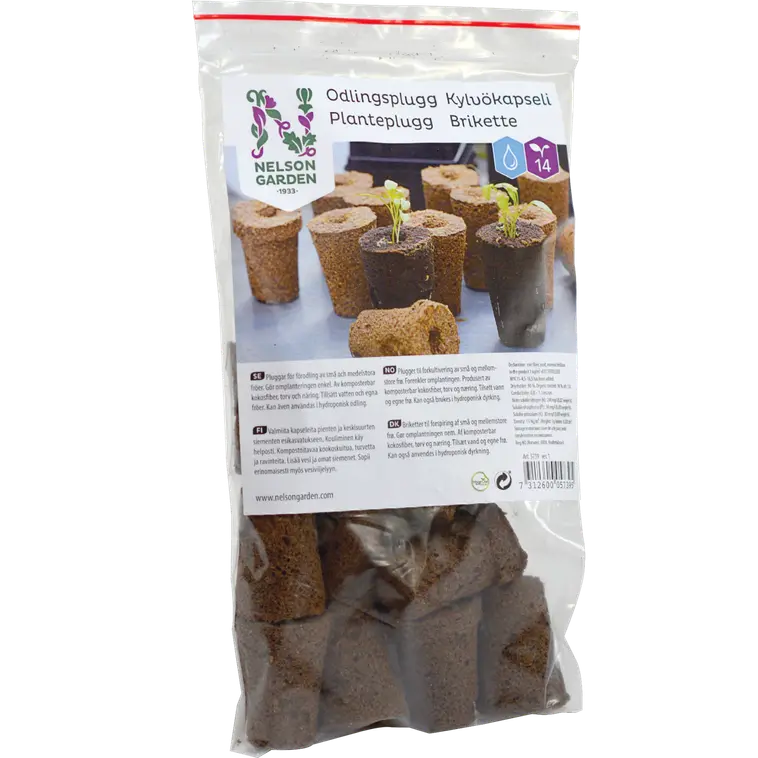 Turvekapseleita kylvömullan sijaan kylvöön/esikasvatukseen/vesiviljelyyn. Kastele briketti hyvin. Kuhunkin kapseliin kylvetään 2-3 siementä. Kapseli on pidettävä kosteana, suositellaan pienoiskasvihuonetta/vesiviljelyastiaa. Kun taimi/pistokas on tarpeeksi suuri, koko briketti istutetaan mullalla täytettyyn ruukkuun tai suoraan kasvupaikalle/annetaan kasvaa vesiviljelyastiassa. 14 kpl/pss.