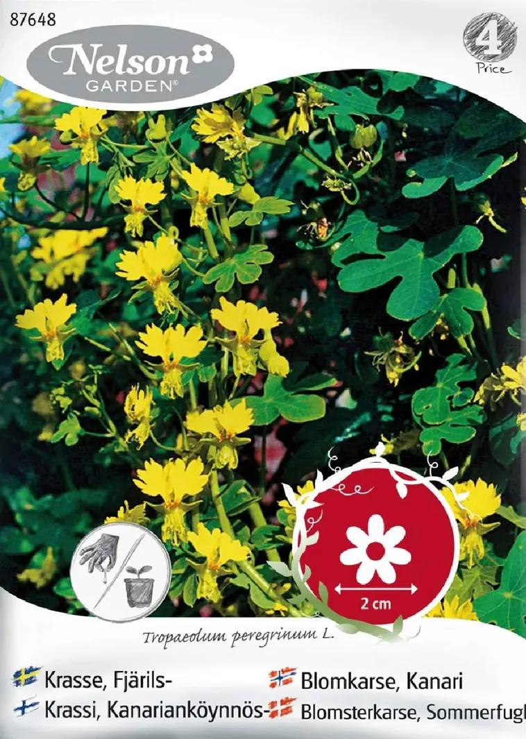 Nopeakasvuinen köynnöskrassi. Vaaleanvihreät lehdet ja keltaiset, hapsureunaiset ja perhosenmuotoiset kukat. Sopii säleikköön, mutta myös parvekelaatikkoon. Liota siemeniä ennen kylvöä.
