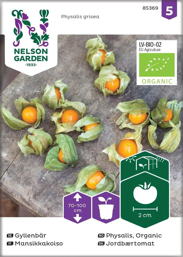 Luomulaatuinen siemen. Mansikkakoiso on erittäin makea marja. Viljellään kasvihuoneessa. Marjojen ympärillä on vaaleankeltaiset, paperilyhtymäiset lehdet. Kerätään, kun marjat ovat kellertäviä. Jälkikypsytetään sisällä.