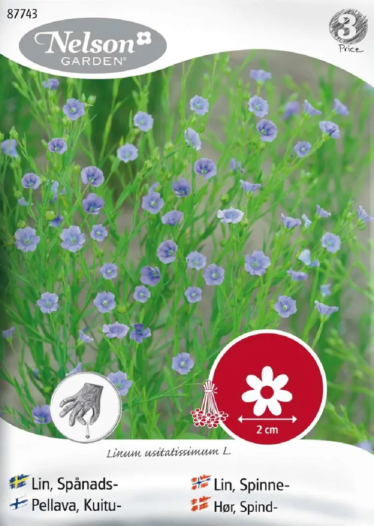 Sinikukkainen kuitupellava. Siemenkodat ovat koristeelliset, korjaa kun ne ovat muuttumassa ruskeiksi. Sido varret nipuiksi ja kuivata ne latvat alaspäin.