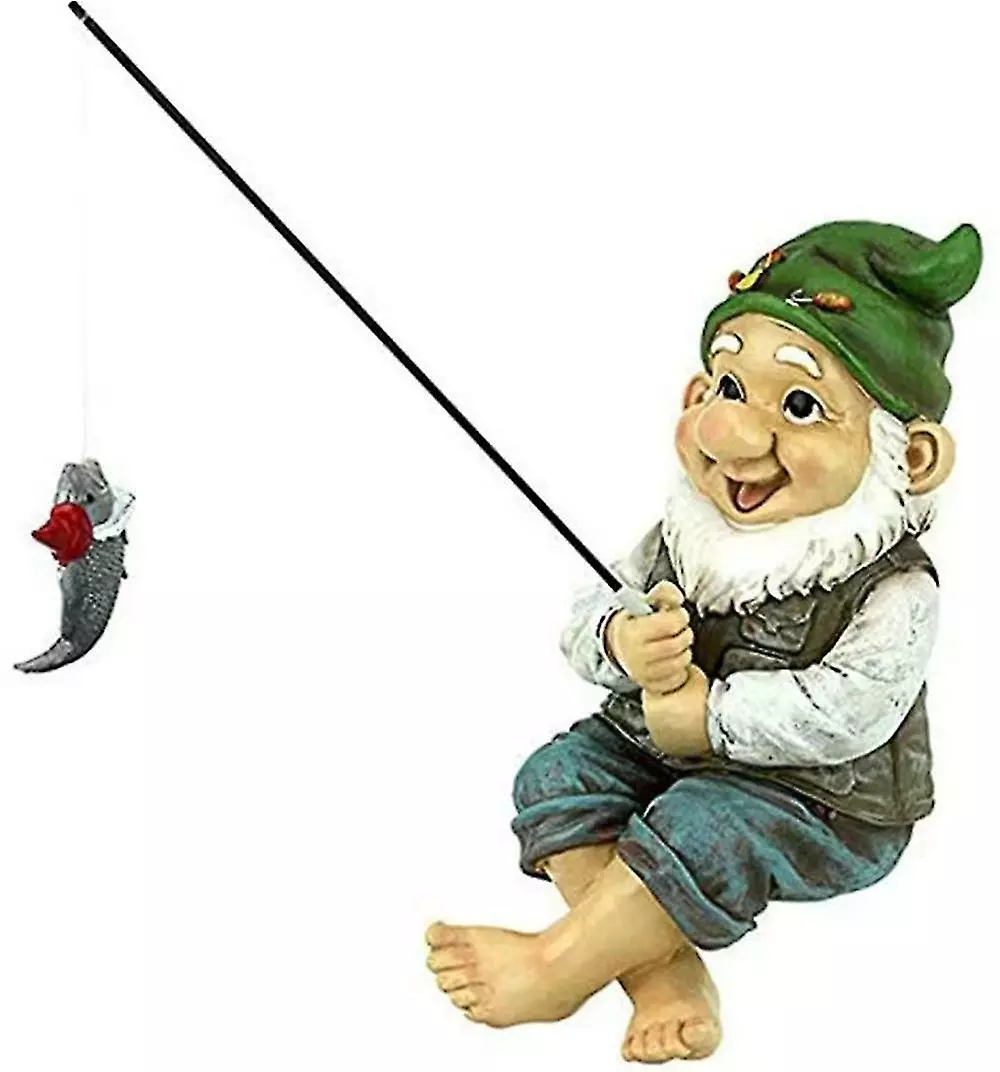 Our garden gnome is ready to sit on the edge of your garden wall or pond at any time and has caught a small fish with a red hat and pygmy beard.