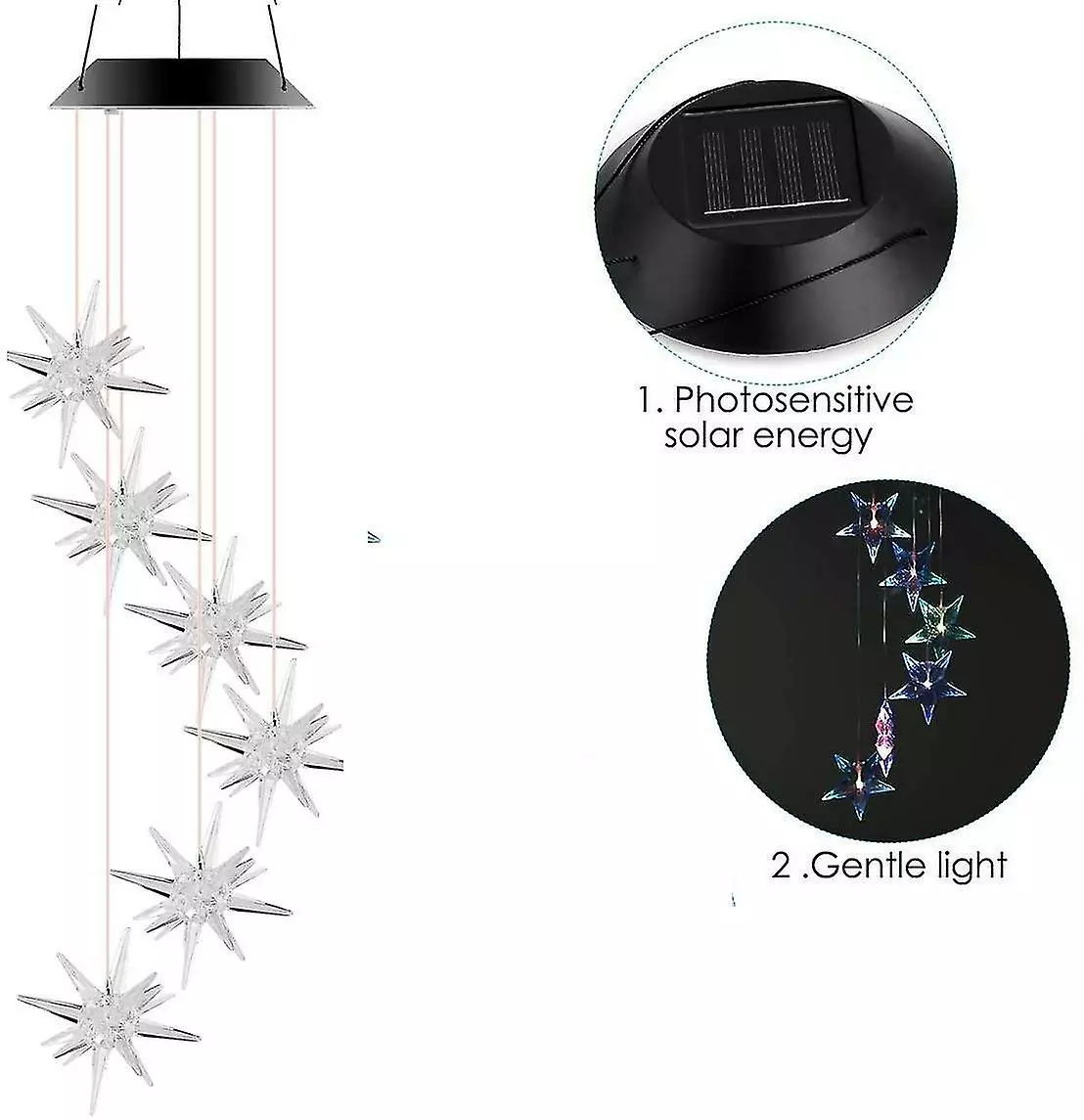 Solar panel: 2V 100mA power source: Solar light built-in battery capacity: 1.2V 600mAh charging time: 8 hours of work: 6-8 hours light color: Color changing material: ABS plastic / PVC